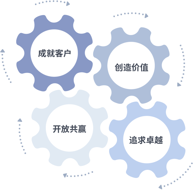 成就客户是一切决策的出发点,,,,创造价值是衡量所有工作的标准,,,,追求卓越是我们做事做人的态度,,,开放共赢是我们的格局也是最终的结果。。价值观的齿轮环环相扣,,,,推动着组织里的每个人不断向前。。。